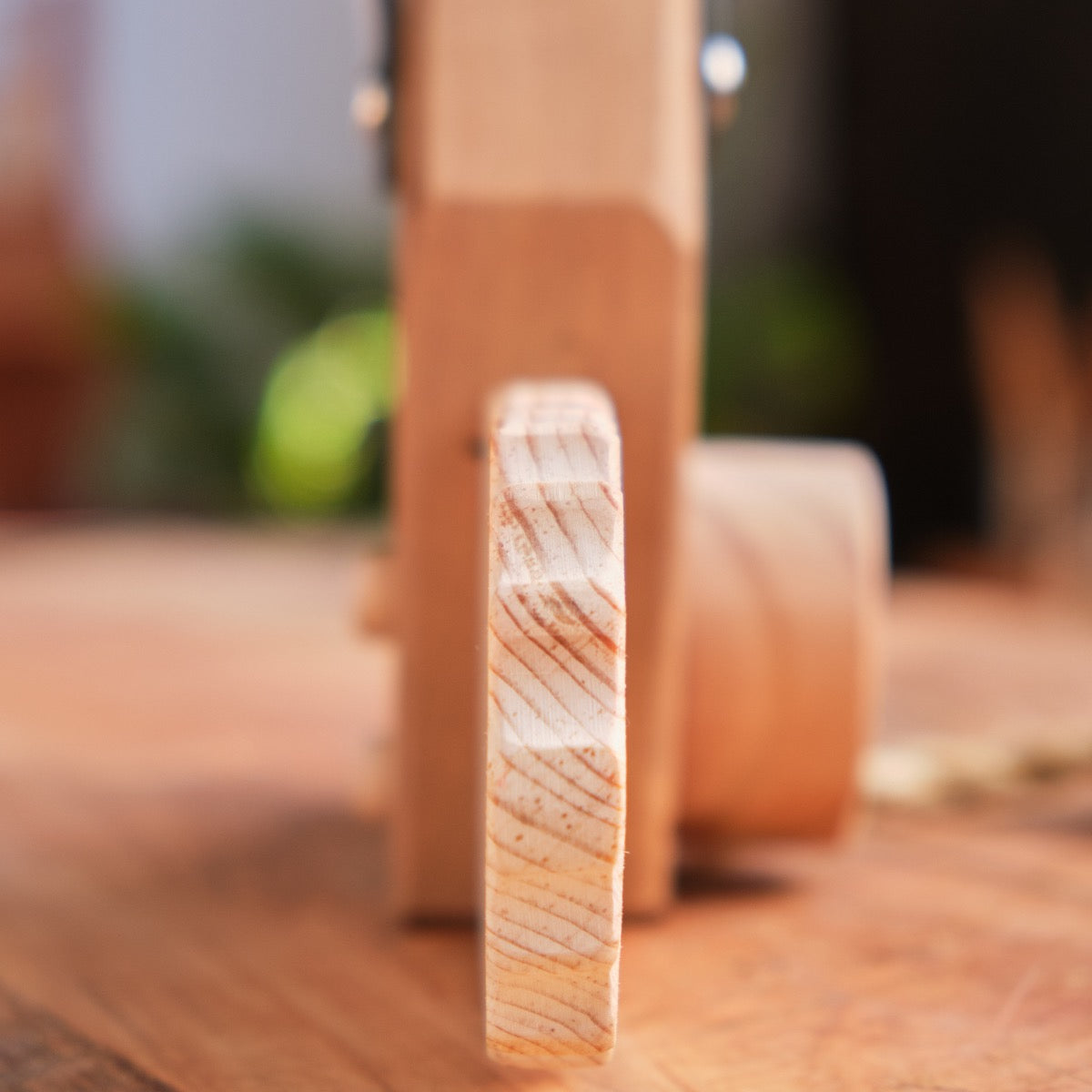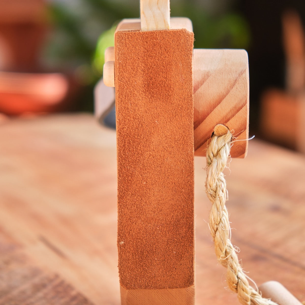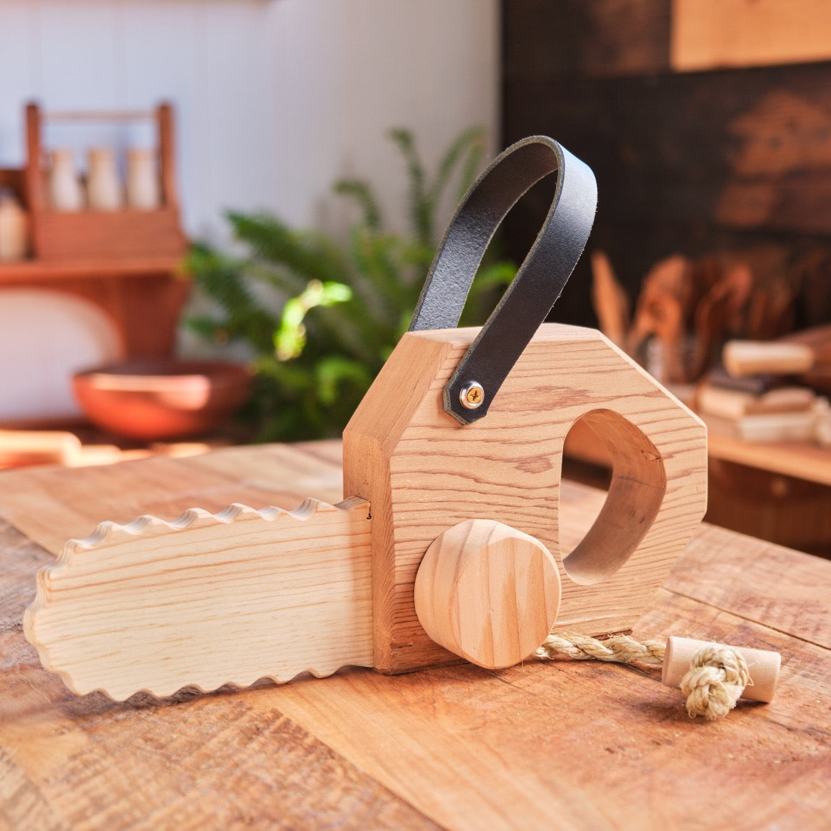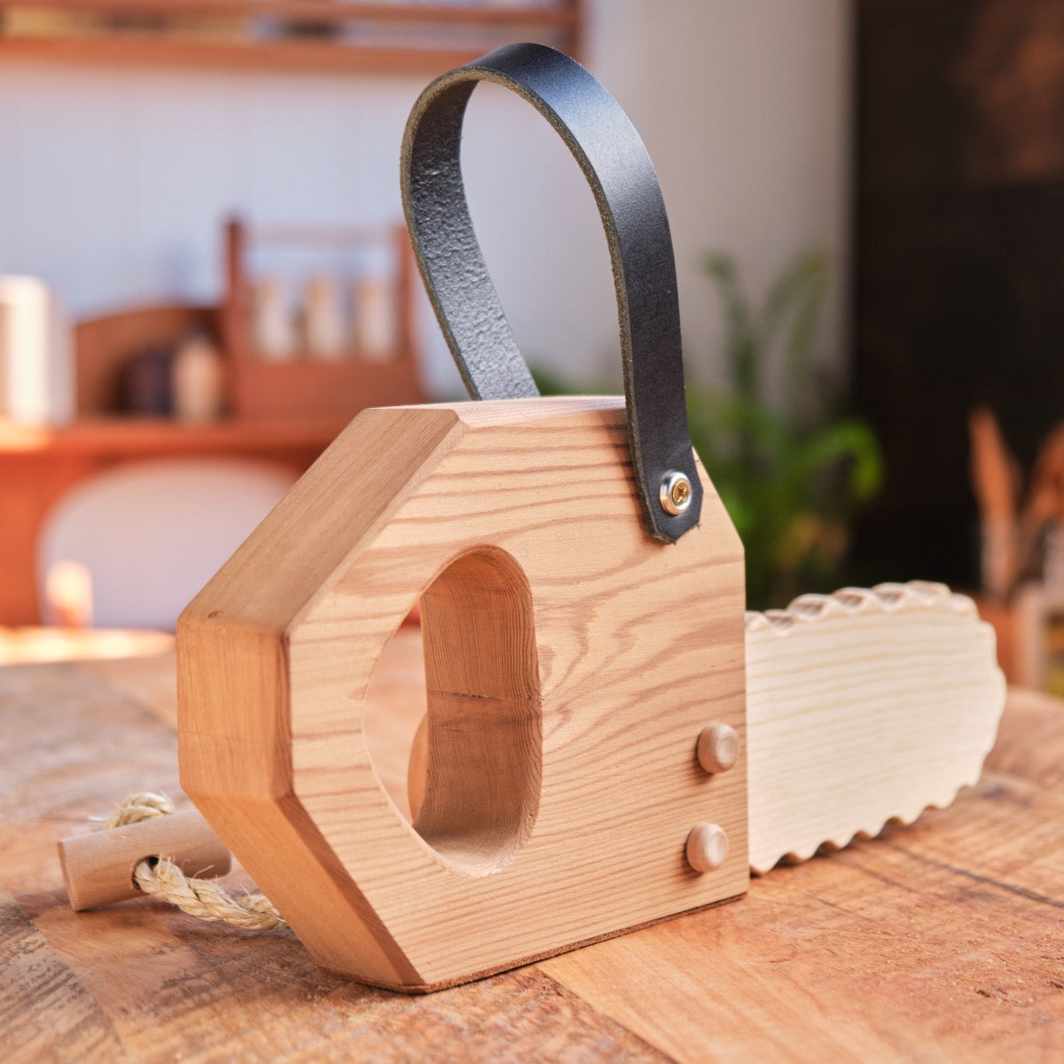 Calling all lumberjacks! Your little boy or girl will have loads of fun pretending to cut wood just like Dad and Mom. Natural and unfinished, lightweight yet sturdy. This sturdy wooden pretend chainsaw is made of cedar, pine, leather and jute twine. **These chainsaws do have natural knots in the wood.**