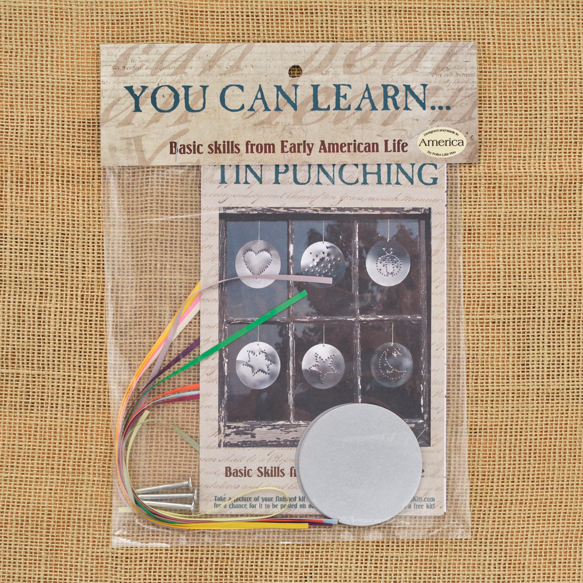 Learn the old art form of Tin Punching and create a series of ornaments with this do-it-yourself kit. A natural crafts kit by You Can Learn. This Tin Punch Kit includes 12 tin discs, 3 flat head nails, patterns, ribbon and clear, accurate instructions. You supply the hammer.